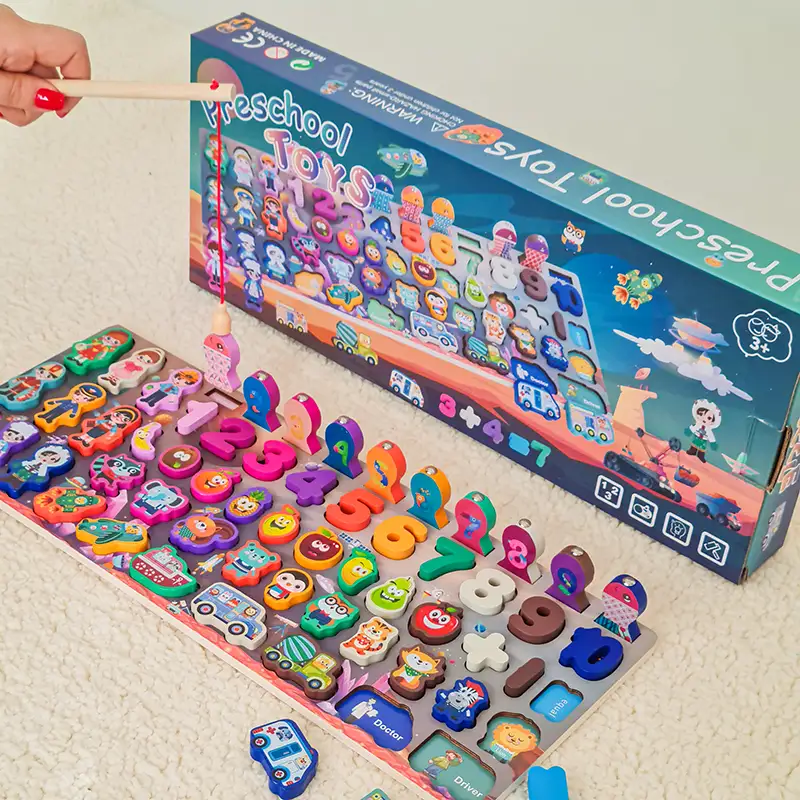 - اسباب بازی هوش و سرگرمی مونته سوری بازی ای سرشار از هیجان و شادی که ساعت ها کودک شما را به خود جذب میکند و مناسب برای بازی کودکان بالای 3 سال می باشد.این اسباب بازی دارای جورچین اعداد انگلیسی، می باشد که کنار آن بازی ماهیگیری انجام می شود به این صورت که روی هر ماهی عددی درج شده وجود دارد بنابراین کودک ترتیب و شمارش را یاد می گیرد. همچنین جورچین این اسباب بازی دارای اعداد انگلیسی ، اشکال مختلف مانند میوه ها،لباس مشاغل، حیوانات، پنج ضلعی، 3 عمل اصلی در ریاضی و …. می باشد که کودک می تواند بازی با آن را انجام دهد و با اعداد ، ریاضی و همچنین رنگ ها آشنایی پیدا کند.