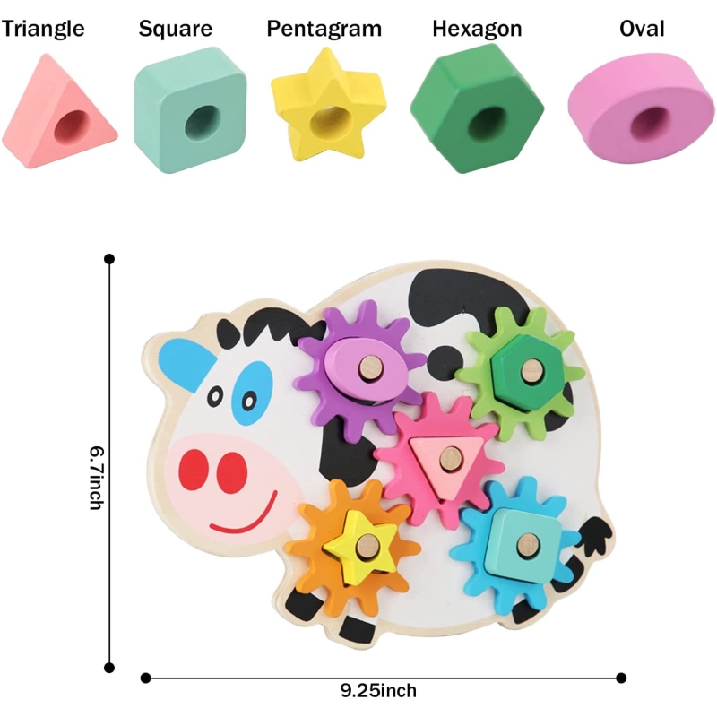 - این اسباب بازی چوبی شامل 5 چرخ دنده و 5 شکل هندسی مختلف هست که کودک اشکال هندسی رو روی چرخ دنده های مخصوص قرار بدن تا این چرخ دنده ها کامل بشن.اگر چرخ دنده ها را روی ستون های کنار هم قرار بدین و به هم چفت و بست بشن میتونین با چرخوندن یک چرخ دنده باعث چرخش باقی اونها هم بشین.