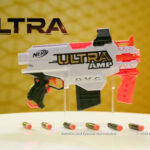 سری Ultra از تفنگهای نرف که جدیداً به بازار عرضه شده است بیشترین بُرد پرتاب تیر را در بین محصولات این برند دارد. تفنگ Nerf Ultra Amp از این سریِ جدید، دارای خشاب جداشونده با قابلیت نگهداری 6 تیر را در خود جای میدهد. برای شلیک فقط کافیست که تیر را درون خشاب بگذارید، هدفگیری کنید و سپس دکمه زیر ماشه و خود ماشه را همزمان فشار دهید. با هر بار شلیک شما، فقط یک تیر پرتاب میشود که تا حدود 36 متر بُرد دارد. همچنین این تفنگ امکان اتصال قنداق و خشاب تفنگهای دیگر سری Ultra را نیز دارد.