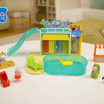 ست بازی Peppa Pig مدل پارک آبیکودکان میتوانند روزی پر از هیجان را در پارک آبی با شخصیتهای محبوب پپا پیگ تصور کنند. ابتدا از درهای اتاق تعویض لباس به طرف استخر بروید! سپس از آسانسور به شکل نهنگ به طبقه دوم رفته، و بعد از آن با شناور فلامینگو از سرسره پایین بیایید! در استخر شنا کرده، سپس وانمود کنید که با یکی از حولهها خشک میشوید، و بعد یک ساندویچ از اسنک بار بگیرید! شخصیتهای جورج و پپا که در این مجموعه لباسهای شنا به تن دارند، به کودکان این امکان را میدهند تا صحنههایی از برنامه را بازسازی کنند یا ماجراجوییهای خود را تصور کنند.